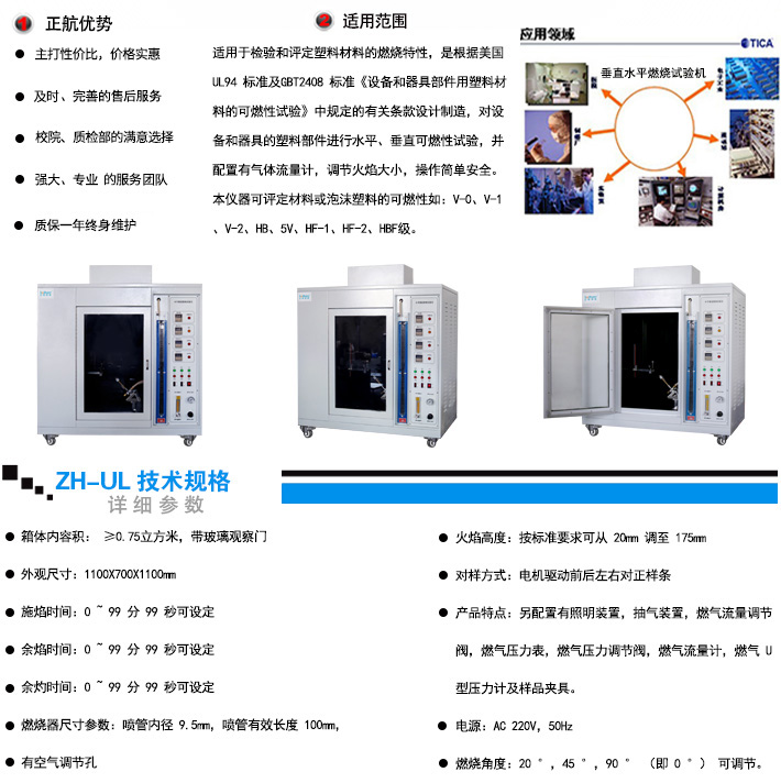| 產(chǎn)品特點:對設(shè)備和器具的塑料部件進(jìn)行水平、垂直可燃性試驗,并配置有氣體流量計,調(diào)節(jié)火焰大小,操作簡單安全。另配置有照明裝置,抽氣裝置,燃?xì)饬髁空{(diào)節(jié)閥,燃?xì)鈮毫Ρ?,燃?xì)鈮毫φ{(diào)節(jié)閥,燃?xì)饬髁坑嫞細(xì)?U 型壓力計及樣品夾具. | |